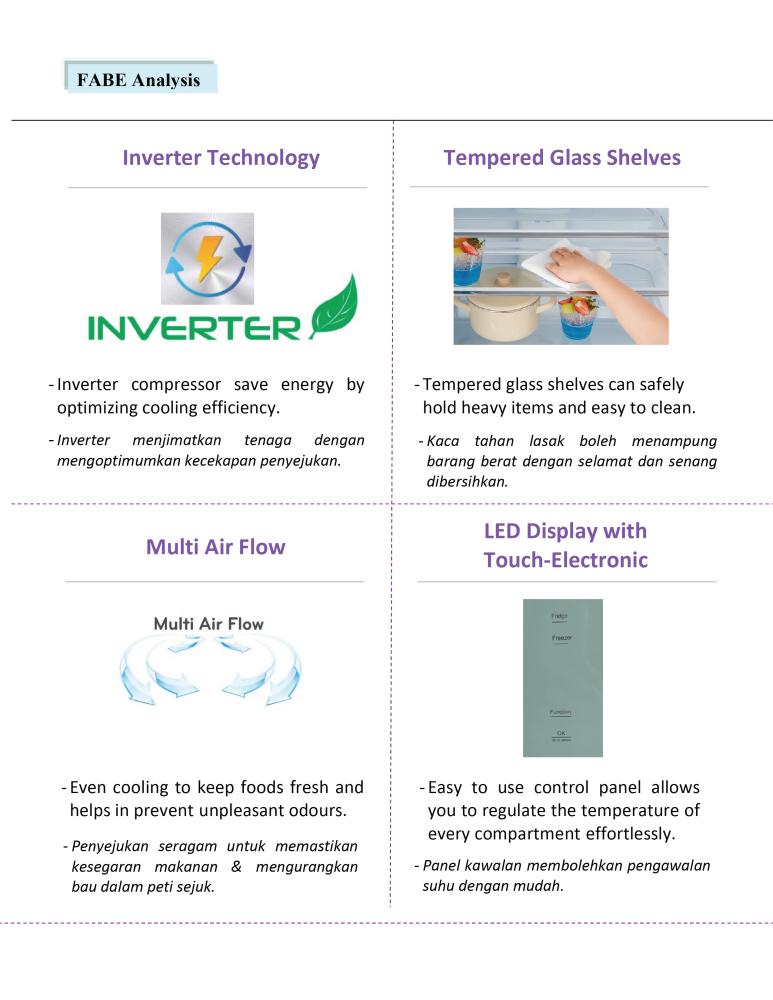 This model is designed for customers who value both space and efficiency. The absence of a center divider allows maximum flexibility in arranging storage. Its equipped with Inverter Compressor, Frost Free System, LED Display with Touch-Electronic, Multi-Air Flow and unique design of glass door.
